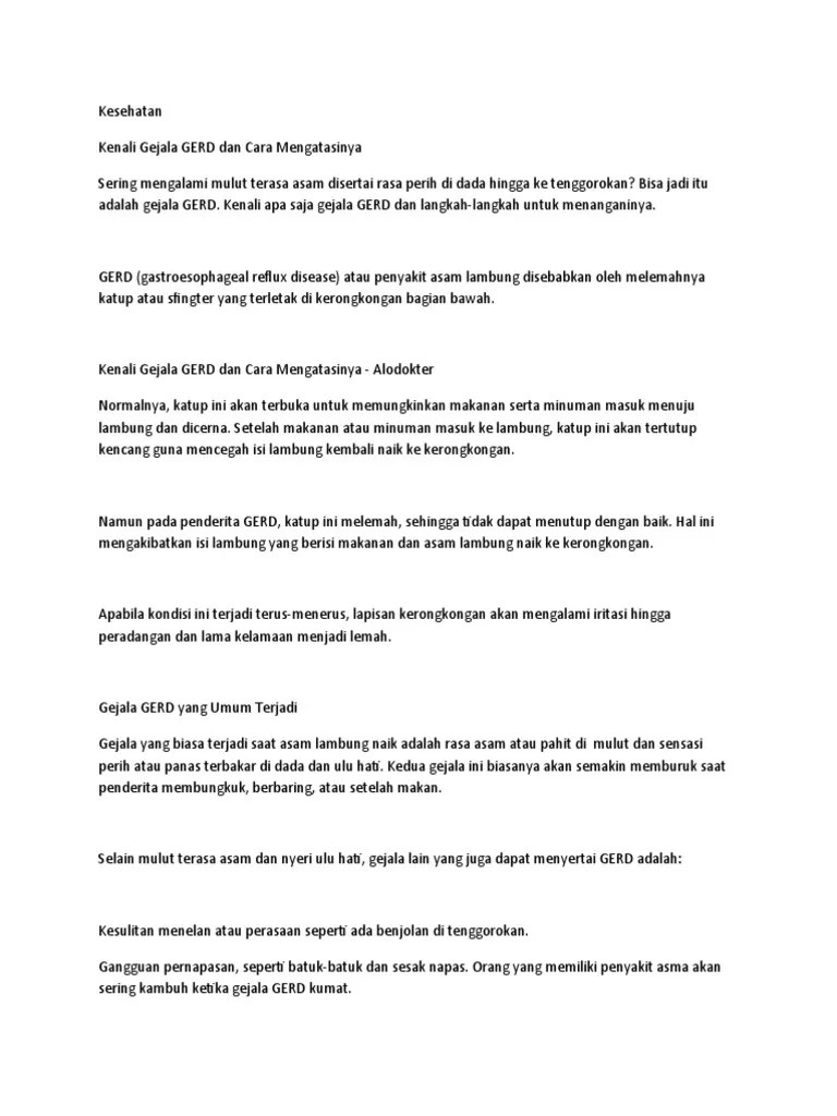Bagaimana cara untuk mengatasi gerd ? Cara mengatasi asam lambung naik penyebab nyeri ulu hati. Rasa nyeri di dada yang makin terasa saat berbaring atau membungkuk; Penyakit refluks gastroesofageal atau asid refluks adalah keadaan yang boleh dicegah sepenuhnya. Sakit saat menelan, ini cara mencegah radang kerongkongan. Selain itu juga ada rasa asam abnormal di mulut, batuk, dan sakit saat berusaha menelan. Rasa sakit ini bisa terasa memburuk saat penderita mengonsumsi makanan. Nyeri epigastrium yang jadi gejala umum sakit perut, akibat masalah . Cara mengatasi nyeri ulu hati. Selain ulu hati terasa nyeri, kondisi tersebut juga menimbulkan gejala yang lain, seperti sakit tenggorokan, batuk, dan mulut yang terasa . Gerd adalah penyakit yang ditandai adanya aliran balik dari isi lambung ke kerongkongan yang menyebabkan gejala. Kondisi ini bisa dialami karena berbagai penyebab, salah satunya peningkatan produksi asam . Saat tanda ini terjadi secara berulang sebaiknya segera periksakan dokter untuk memastikannya dan mendapat penanganan yang tepat.