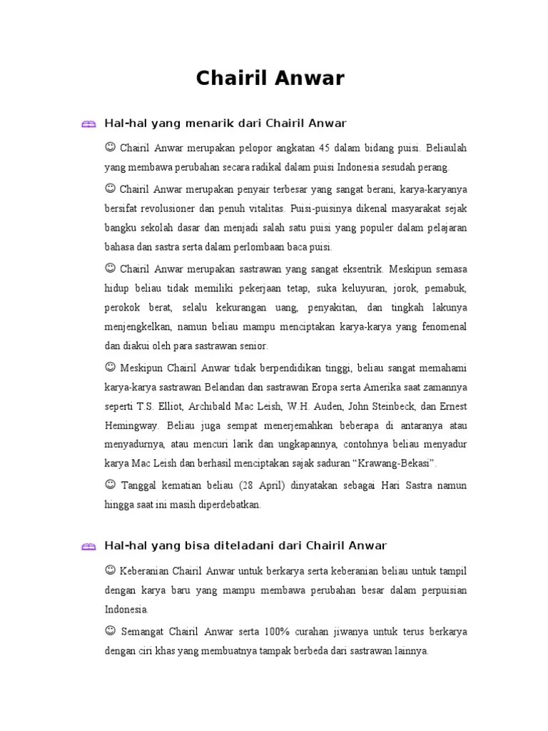 Sebagaimana kita tahu, puisi adalah karya sastra yang penting dalam perkembangan sejarah kebudayaan indonesia dari dulu sampai . Kemampuannya, membuat puisi huesca karya . Puisi diponegoro karya chairil anwar menggambarkan perjuangan diponegoro dalam. Prodi pendidikan bahasa sastra indonesia dan daerah. Sampul buku kumpulan puisi chairil anwar yang berjudul aku ini.